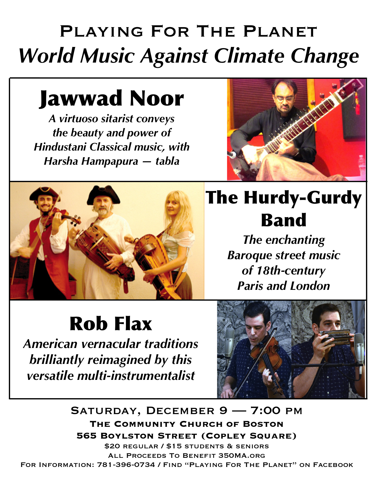 On Saturday, December 9, the sixteenth “Playing For The Planet” benefit concert showcases master musicians from three different musical traditions, in a benefit for the environmental advocacy group 350MA.org.