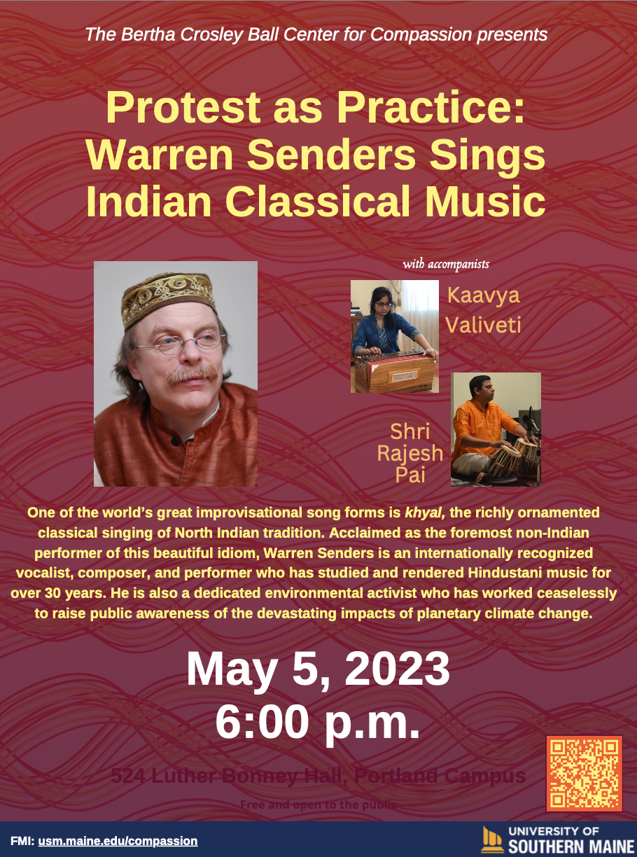 One of the world’s great improvisational song forms is khyal, the richly ornamented classical singing of North Indian tradition. Accompanied by the harmonium of Kaavya Velivati and the tabla of Harsha Hampapura, Warren Senders weaves a hypnotic tapestry of sound in his renditions of traditional ragas.